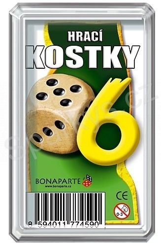Sada šiestich drevených hracích kociek s návodom pre hru kocky.